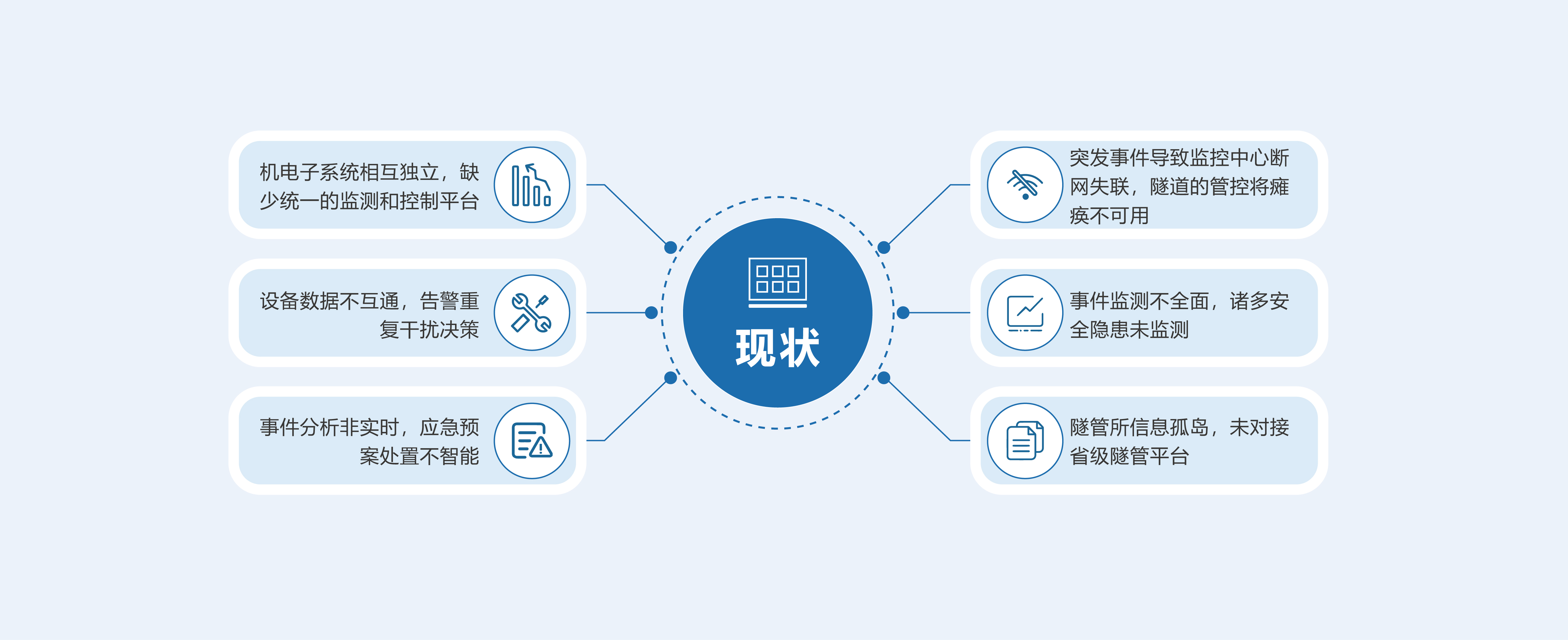高速公路隧道机电设施设备种类多,缺少统一的系统能对隧道所有机电设施设备实现监测和控制,缺乏对隧道运行情况的全局监控视角和远程管控手段,缺乏隧道现场的自动监测,自动化、智能化程度低。